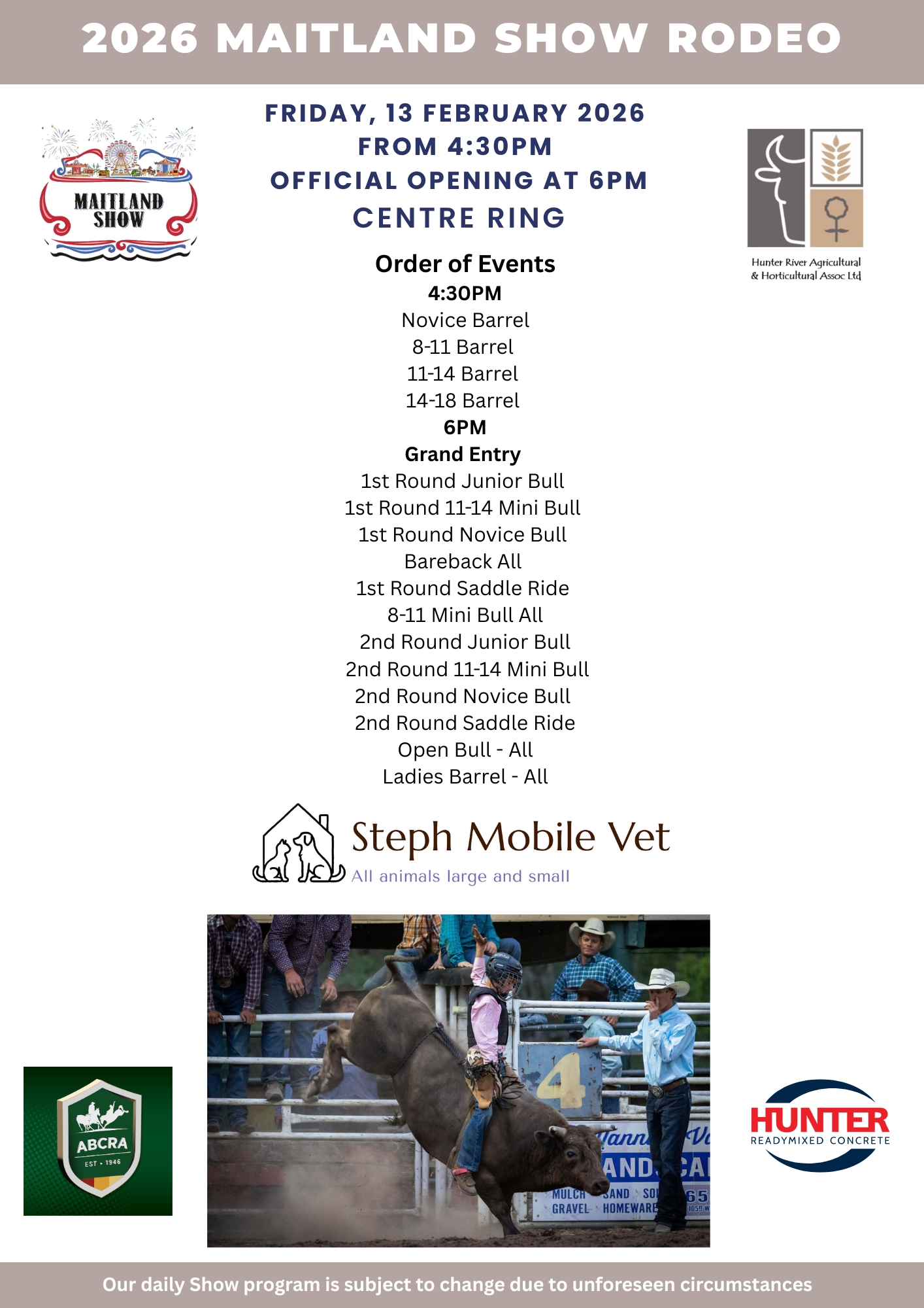 In 2004 Maitland Show went a long way to re-establishing itself as the premier regional show in New South Wales with three day attendances exceeding 55,000 people. This outcome was achieved as a result of a joint venture between the Showmen’s Guild of Australasia and the Show Association providing for a free gate, family orientated special attractions. The Maitland Showground has become the permanent home for the Showmen’s Guild inaugural Super Show held at Speers Point. Over the last five years, Maitland has entertained over 500,000 people at the annual Show. We believe, will see its future secure, building on over 150 years plus of past performance.