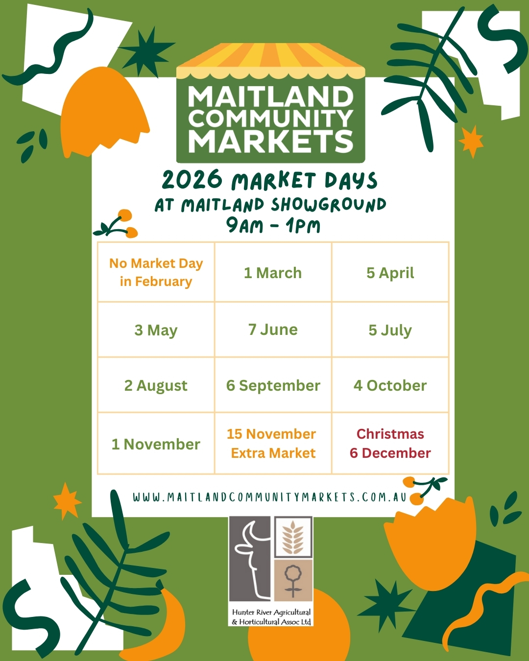 Please note that there will be no market in February 2026 due to the running of the Maitland Show 13-15 February 2026.