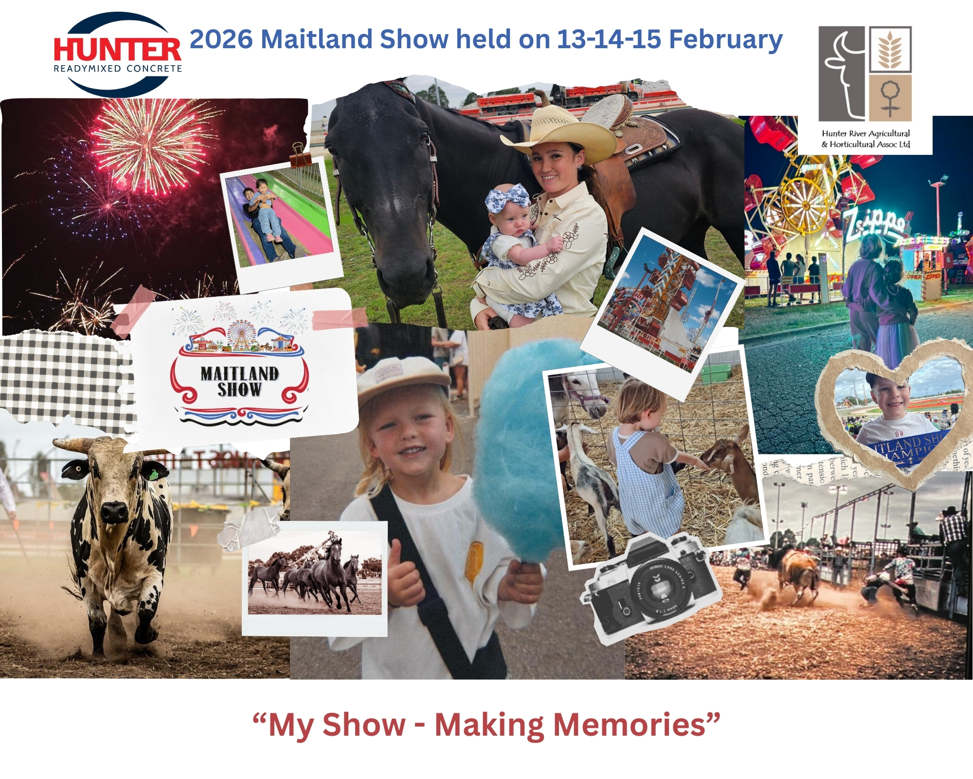 We would like to thank to acknowledge our local community, volunteers, show committee, Naming Rights Sponsor Hunter Ready Mixed Concrete, Gold Sponsors Maitland Toyota and Hunter Water along with major sponsors Flower Power, Fulton Hogan, and Punt Hill Apartments Maitland and all donations that contribute to making our 2026 Maitland Show “My Show – Making Memories” a wonderful success.