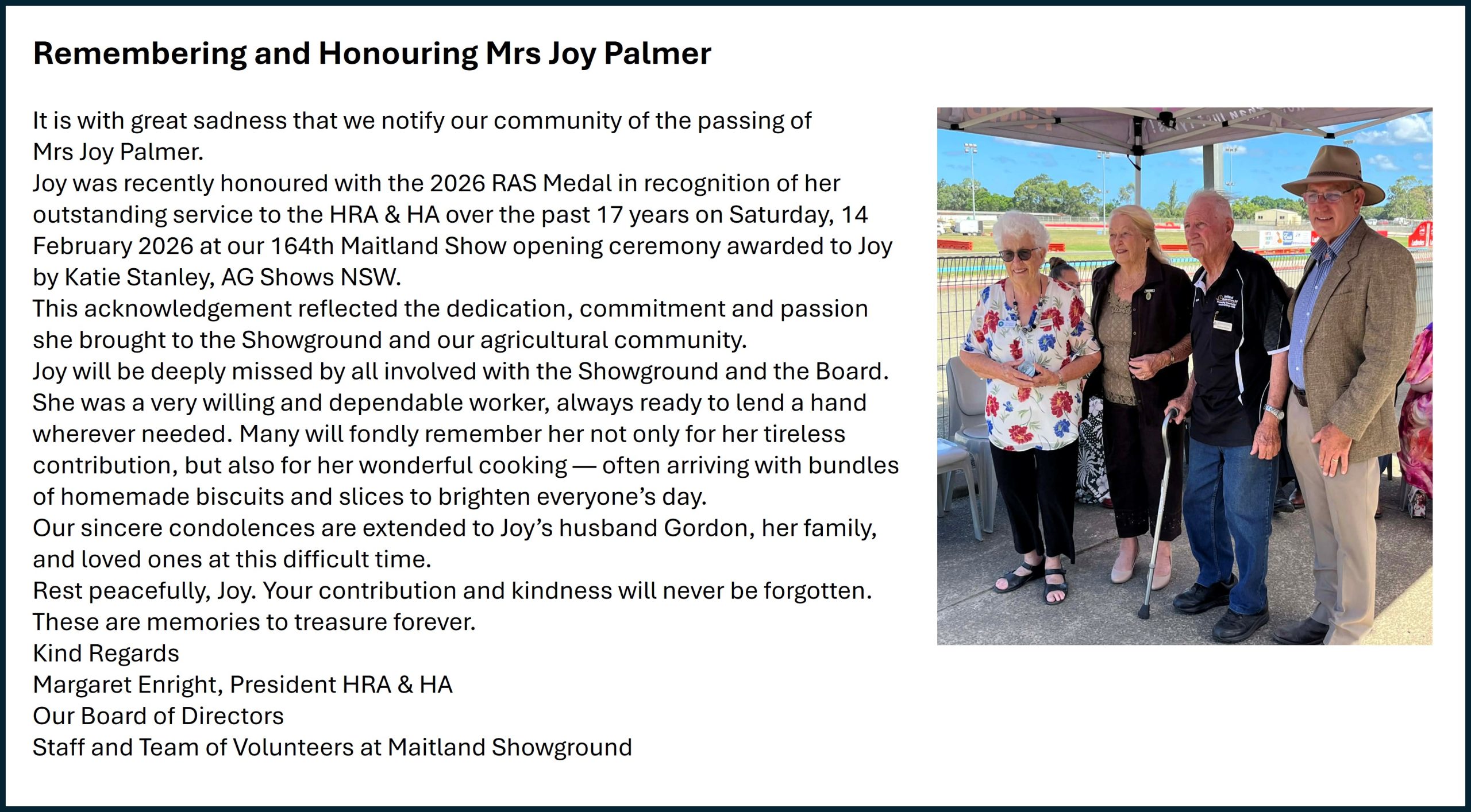 We acknowledge the passing of Bernie Sarroff, HRA&HA Past President 2003-2009 and Association Secretary 2009 -2017.